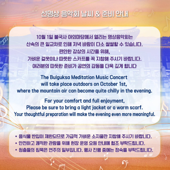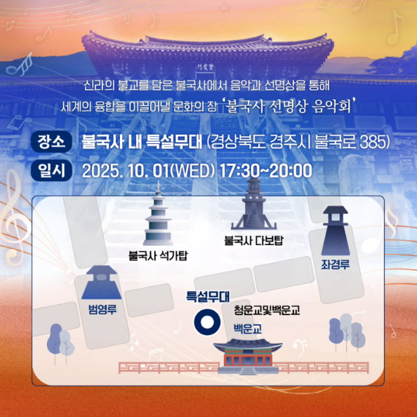 APEC 2025 불국사 선명상음악회 페이지 정보 작성자 최고관리자 댓글 0건 조회 950회 작성일 25-09-24 11:30 본문 불국사 특설무대 선착순 좌석 100석 모집 진행 중 (좌석은 추첨에 의하여 배정되며, 티켓 배부처에서 티켓을 수령하신 후 입장하셔야 합니다)https://form.naver.com/response/DC9qvCnIp231Plbl5DbU6w 목록 이전글제53회 신라문화 영산대재 안내 25.10.08 다음글APEC 2025 솥의 기억 특별전 -불국사박물관 25.09.24