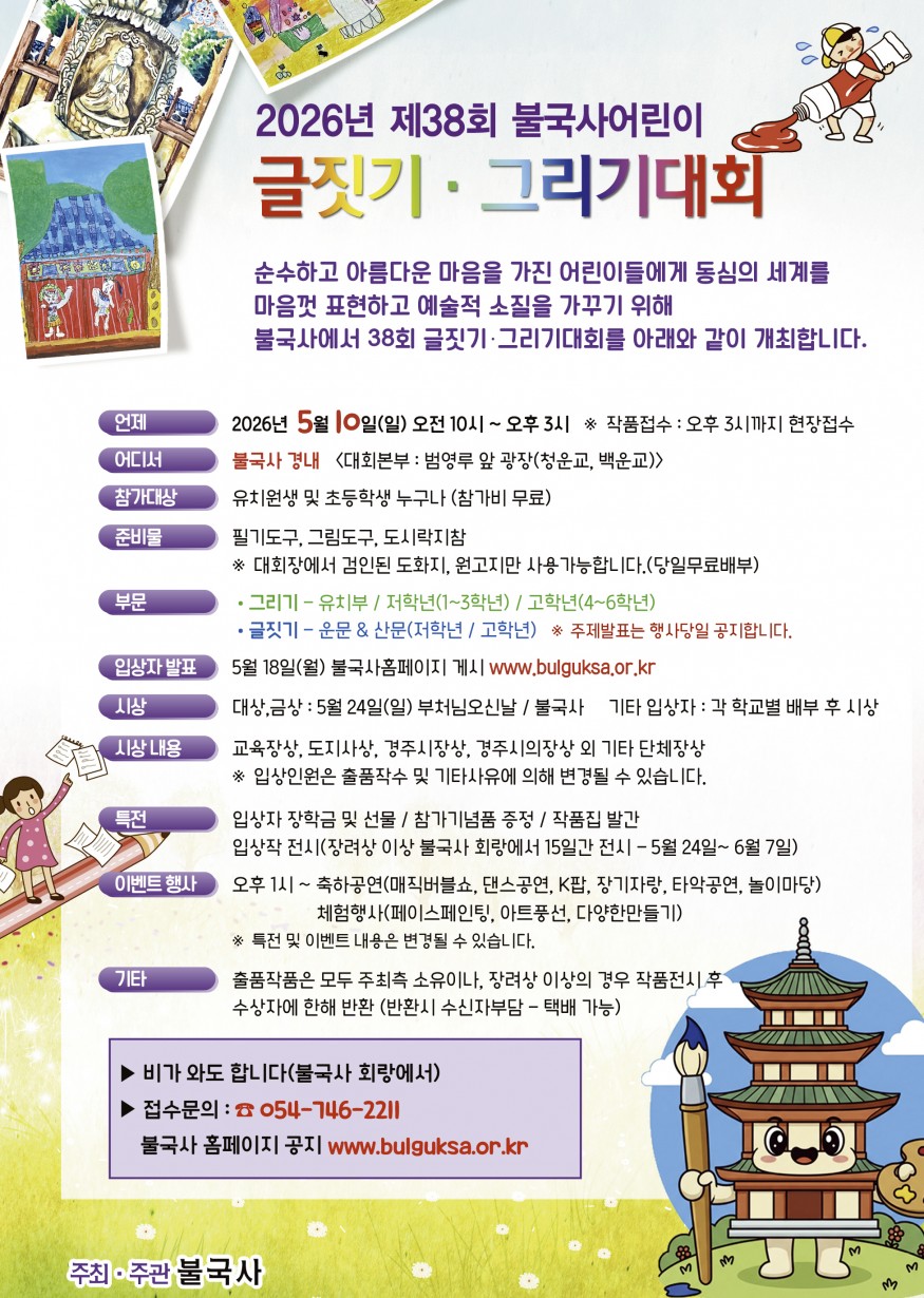 제38회 불국사 어린이 글짓기, 그리기대회 안내 페이지 정보 작성자 최고관리자 댓글 0건 조회 342회 작성일 26-04-06 14:36 본문 제38회 불국사 어린이 글짓기, 그리기대회 안내 목록 다음글대웅전 보수와 입장은 무관합니다. 26.03.08