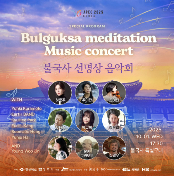 APEC 2025 불국사 선명상음악회 페이지 정보 작성자 최고관리자 댓글 0건 조회 952회 작성일 25-09-24 11:30 본문 불국사 특설무대 선착순 좌석 100석 모집 진행 중 (좌석은 추첨에 의하여 배정되며, 티켓 배부처에서 티켓을 수령하신 후 입장하셔야 합니다)https://form.naver.com/response/DC9qvCnIp231Plbl5DbU6w 목록 이전글제53회 신라문화 영산대재 안내 25.10.08 다음글APEC 2025 솥의 기억 특별전 -불국사박물관 25.09.24
