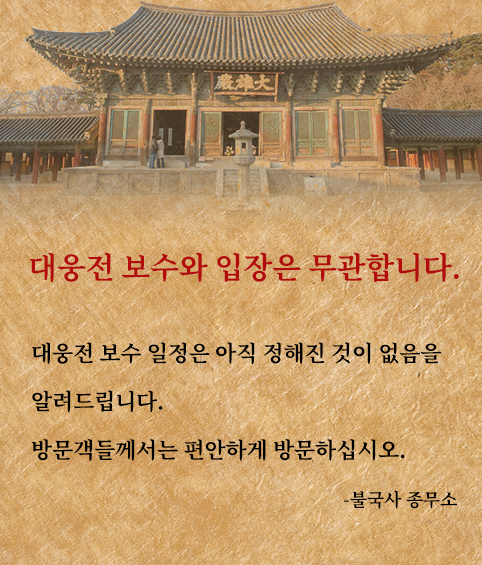 대웅전 보수와 입장은 무관합니다. 페이지 정보 작성자 최고관리자 댓글 0건 조회 64회 작성일 26-03-08 16:39 본문 . 목록 다음글2026년 성도절 기념대법회 불국사문화회관 26.01.16